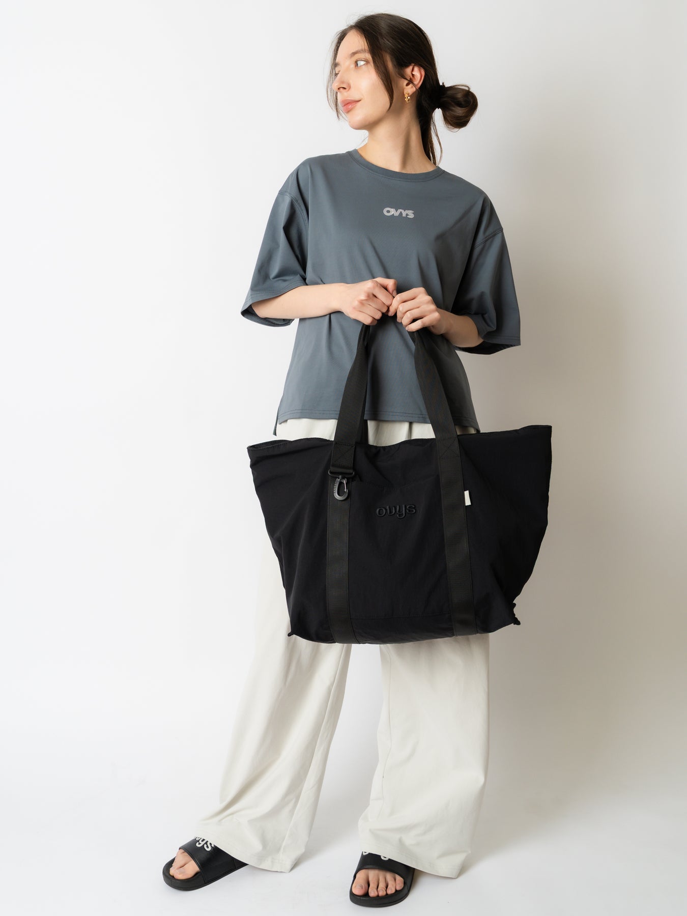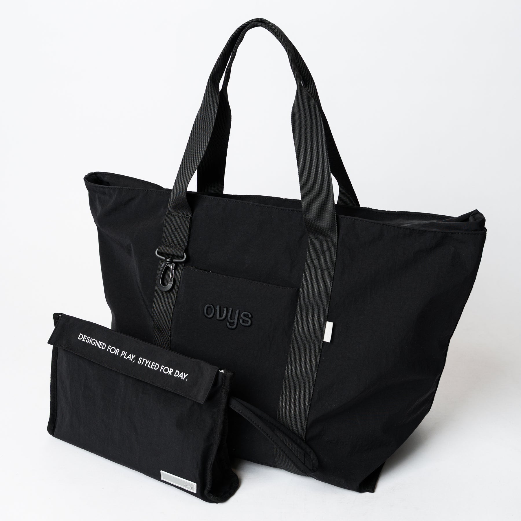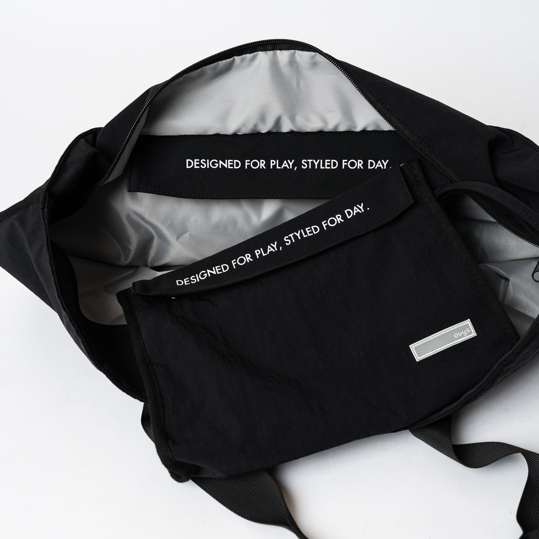 <素材/機能性> 本体には耐久性に優れた高密度ナイロンを採用。摩耗の激しい底面はパイピング処理で補強を施しました。 ストラップには耐久性の高いナイロンテープを使用し、男性でも肩掛けしやすい長さを緻密に計算して設計しています。<スタイル> 装飾を削ぎ落としたミニマルなルックスに、ovysのロゴ刺繍を配置。インダストリアルな雰囲気漂うシャープな印象は、アクティブウェアからジャケットスタイルまで、合わせる服を選ばないノームコアなデザインに仕上げました。