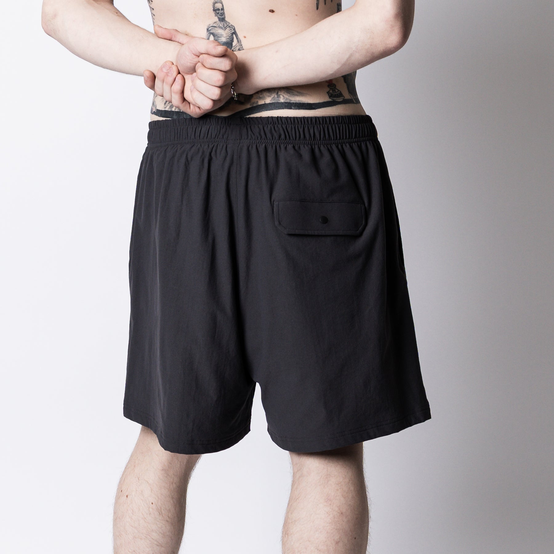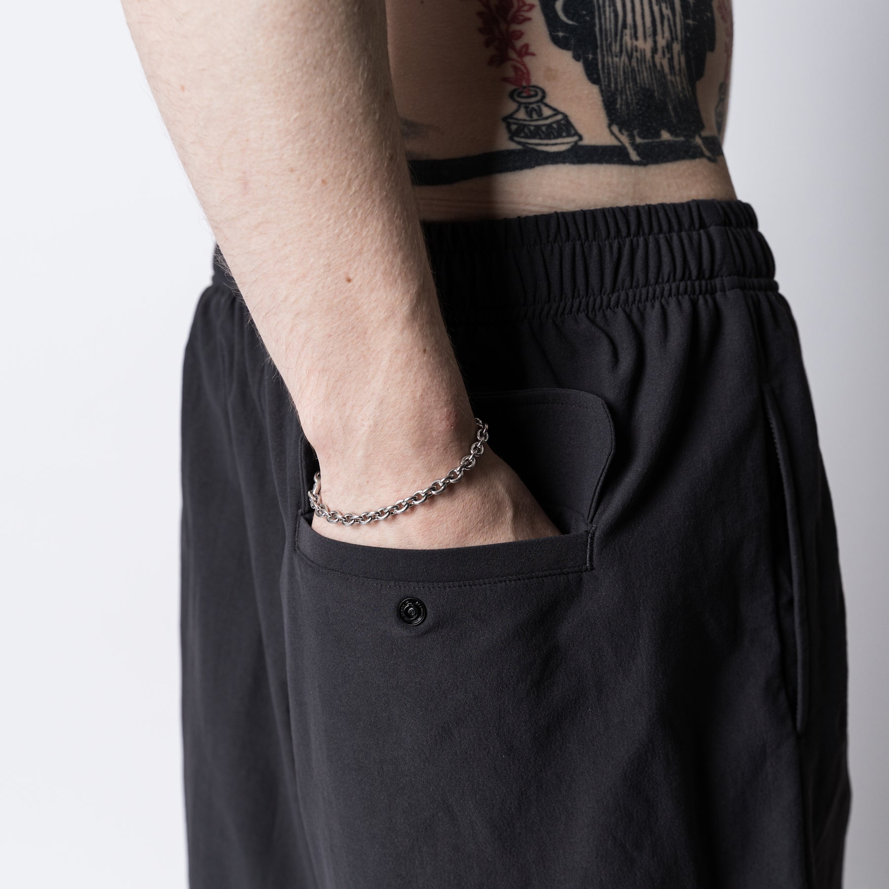 <パターン/シルエット>日常のあらゆるシーンを横断できる、汎用性の高い膝上丈のレングス。内側にはメッシュ裏地を配することで、透けを防止するとともに、発汗時のベタつきを解消しました。ウエストはゴムとドローコードによるイージー仕様、ヒップには小物の携行に便利なボタン付きポケットを配置。機能性と構築的なシルエットが、シーンを選ばない完成度を誇ります。