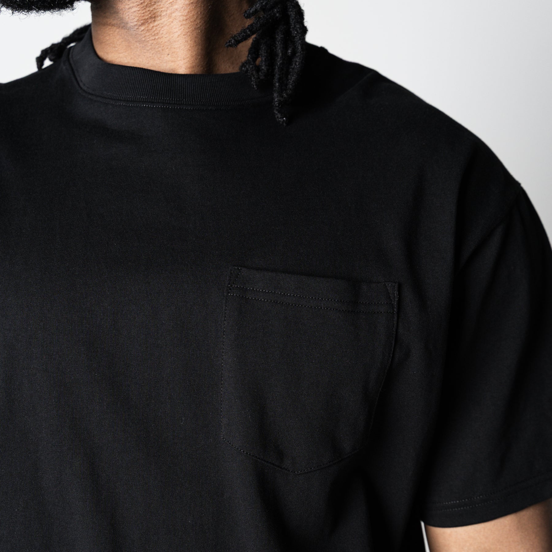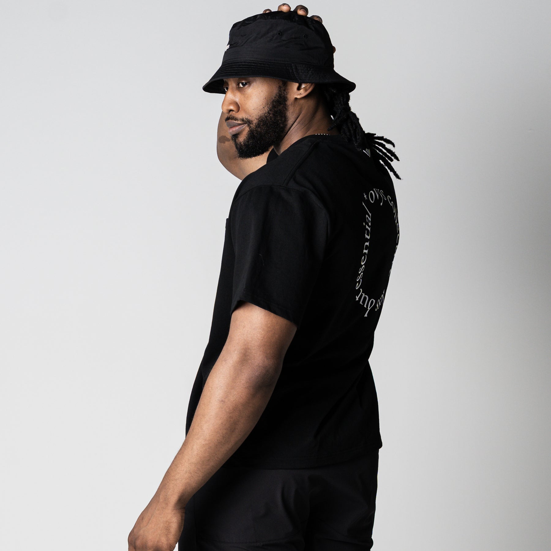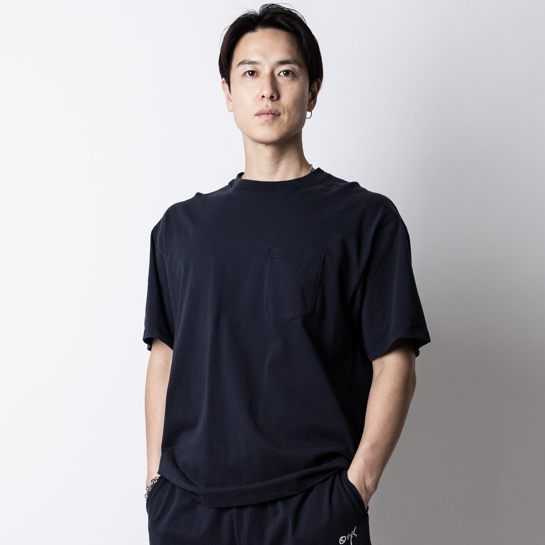 <デザイン/カラー> フロントは無地で構成しつつ、アクセントとして左胸にポケットを配置。 背面には、ブランドの思想である「LESS BUT ESSENTIAL(より少なく、しかしより本質的に)」をサークル状に配置した、象徴的なバックプリントを施しました。 シンプルながらも強いメッセージ性を放つ、アイコニックな一着です。