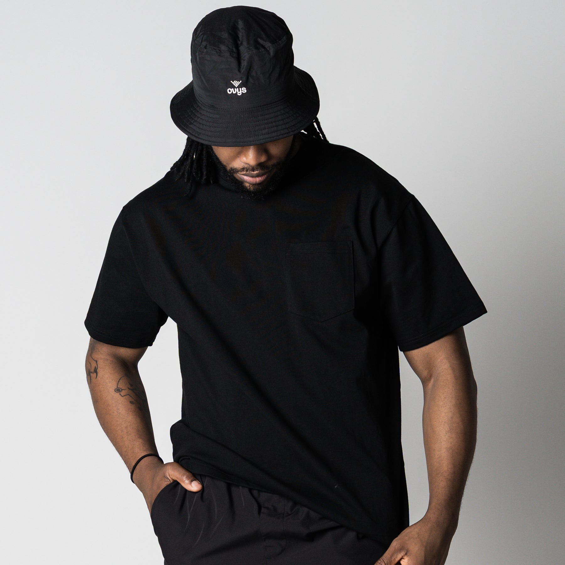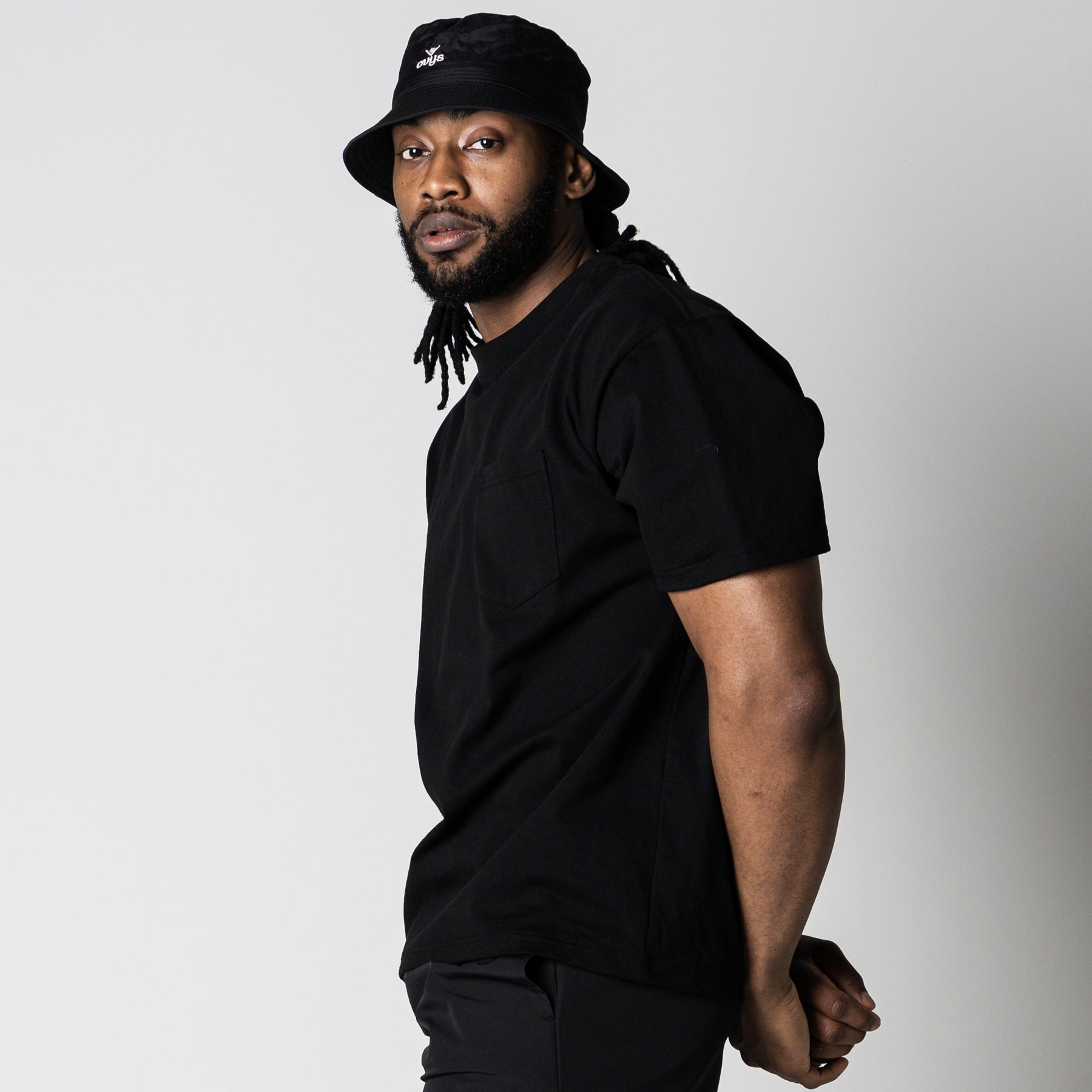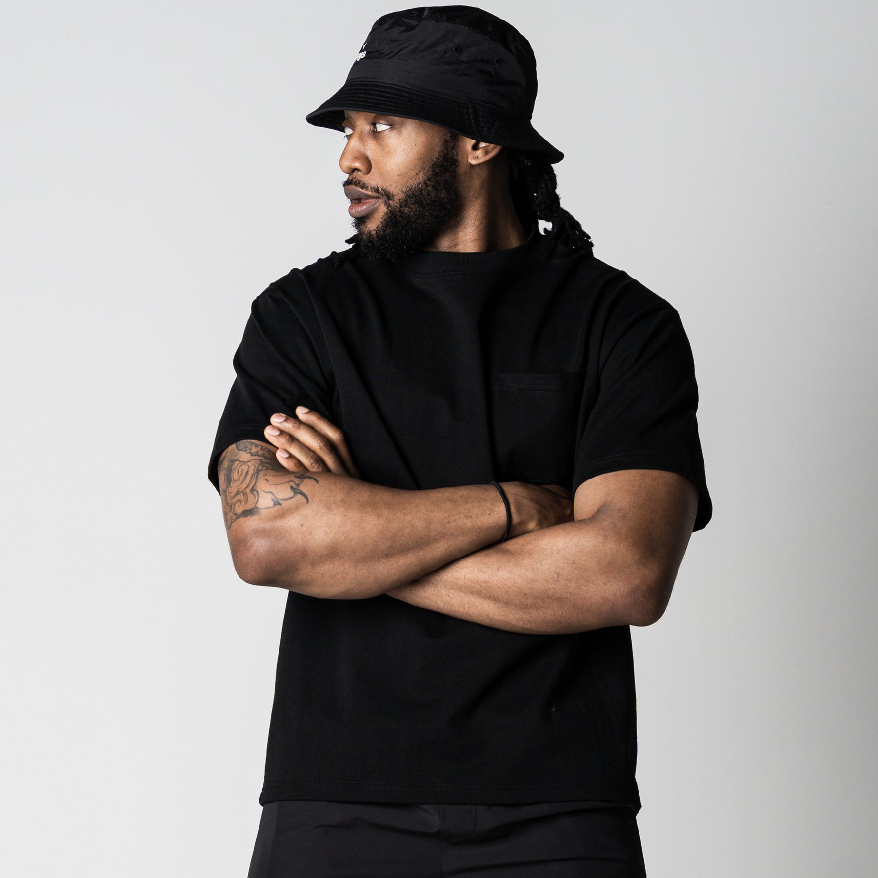 <デザイン/カラー> フロントは無地で構成しつつ、アクセントとして左胸にポケットを配置。 背面には、ブランドの思想である「LESS BUT ESSENTIAL(より少なく、しかしより本質的に)」をサークル状に配置した、象徴的なバックプリントを施しました。 シンプルながらも強いメッセージ性を放つ、アイコニックな一着です。